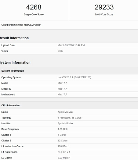 Apple M5 Max продемонстрировал возможности центральных и графических ядер в Geekbench