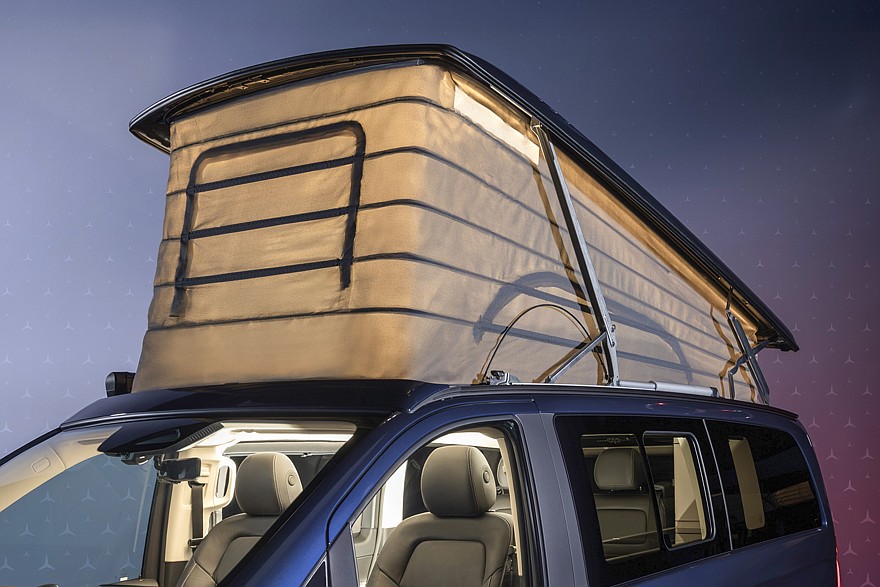 В пресс-службе марки рассказали о том, что «глэмпинг-мобиль» получил новую выдвижную крышу с электроприводом, которая обеспечивает спальное место в верхней части автомобиля. Она имеет прочный и лёгкий алюминиевый каркас с двойной обшивкой. Такая «палатка» остаётся изолированной практически при любых погодных условиях, кроме того, теперь у неё есть дополнительный запас высоты на 10 см (когда задняя секция поднимается на полную высоту).